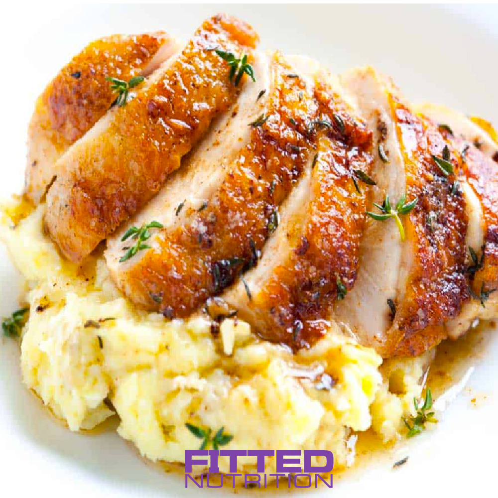 Tierna pechuga a la plancha, acompañada de majado de papa rojas y un “side” de vegetales al vapor… una combinación clásica e ideal y MUY BAJA en Grasas.