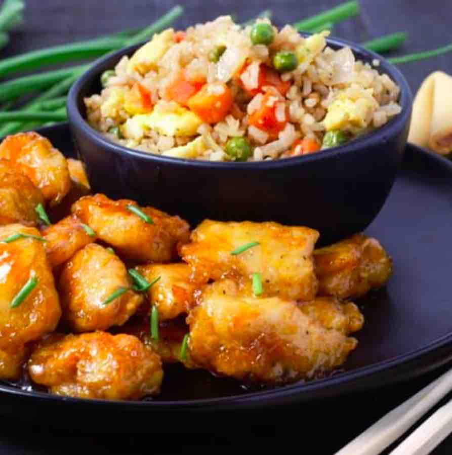 Tiernas tiritas de pollo empanado y envuelto en salsa de naranja, acompañado de arroz oriental